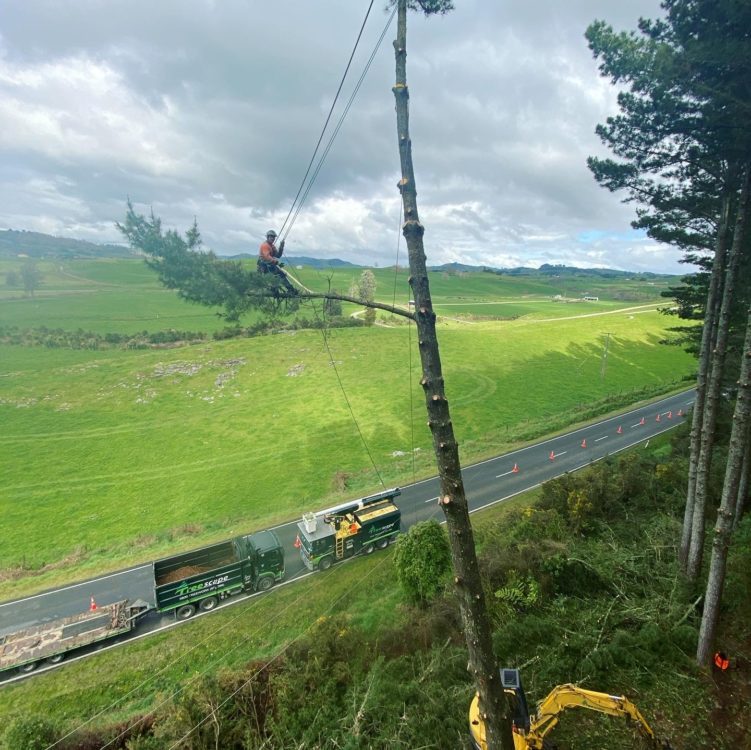 We had four climbers, one digger driver, four ground staff for rigging and two traffic management staff plus the Project Manager. Digger driver helped us stack debris tidily and assist in felling.